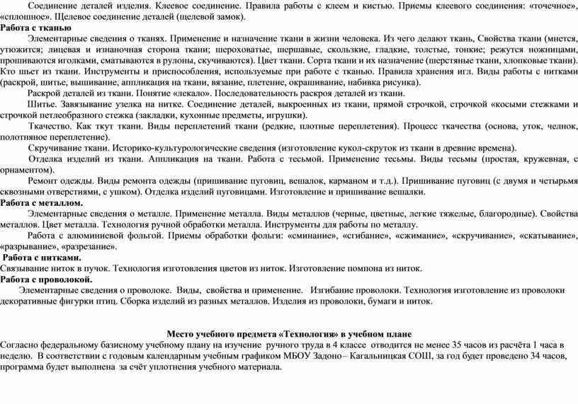 Согласно федеральному базисному учебному плану на изучение ручного труда в 4 классе отводится не менее 35 часов из расчёта 1 часа в неделю. В соответствии с годовым календарным учебным графиком МБОУ Задоно – Кагальницкая СОШ, за год будет проведено 34 часов, программа будет выполнена за счёт уплотнения учебного материала.