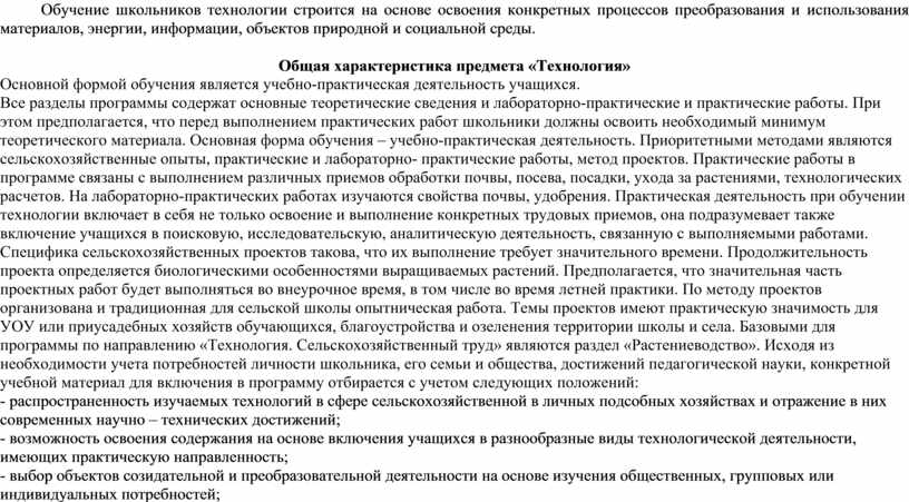 - возможность познавательного, интеллектуального, творческого, духовно- нравственного, эстетического и физического развития учащихся. Каждый раздел программы включает в себя основные теоретические сведения, практические работы и рекомендуемые объекты труда (в обобщенном виде). При этом предполагается, что изучение материала программы, связанного с практическими работами, должно предваряться необходимым минимумом теоретических сведений. Теоретическая подготовка заключается, прежде всего, в формировании ведущих понятий технологий сельского хозяйства – сорт, порода, урожайность, продуктивность и т.д. Основной формой обучения является учебно – практическая деятельность учащихся. Приоритетными методами является сельскохозяйственные опыты, практические и лабораторно- практические работы, метод проектов. Практические работы в программе связанные с выполнением различных приемов обработки почвы, посевы, посадки, уходы за растениями, технологических расчѐтов. На лабораторно-практических работах изучаются свойства почвы, удобрений. Учитель в соответствии с имеющимися в школе возможностями выбирает объекты и темы практических работ для учащихся, чтобы они как можно полнее представляли изучаемые агротехнологии. При этом необходимо учитывать посильность. Рабочая программа по направлению «Технология. Сельскохозяйственный труд» объектов труда для учащихся соответствующего возраста. Практическая деятельность при обучении технологии включает в себя не только освоение и выполнение конкретных трудовых приемов, она подразумевает также включение учащихся в поисковую, исследовательскую, аналитическую деятельность, связанную с выполняемыми работами. Для каждой темы перечислены возможные и наиболее целесообразные с точки зрения реализации минимума содержания виды практической деятельности.