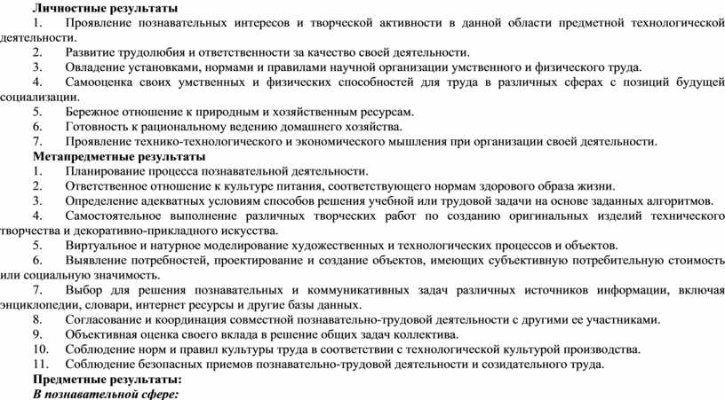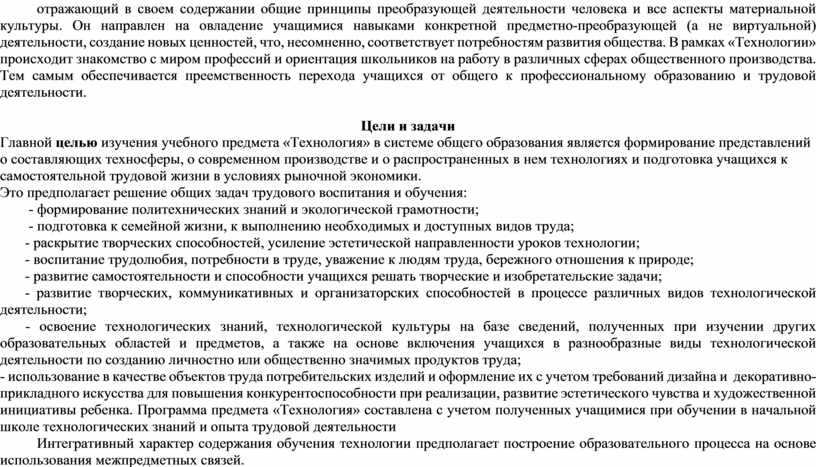 - освоение технологических знаний, технологической культуры на базе сведений, полученных при изучении других образовательных областей и предметов, а также на основе включения учащихся в разнообразные виды технологической деятельности по созданию личностно или общественно значимых продуктов труда;