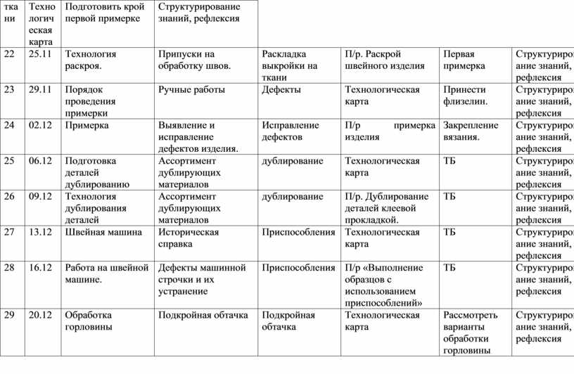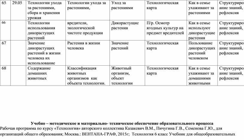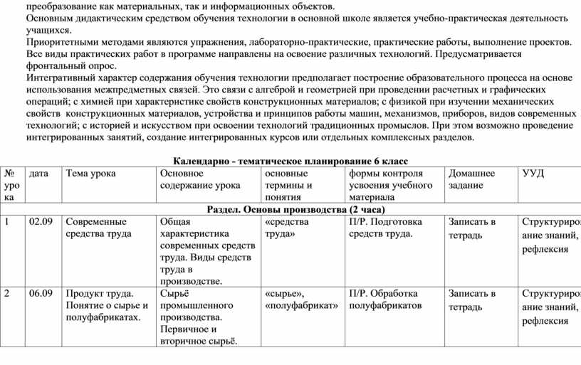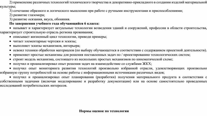 По окончании курса технологии в 6 классе основной школы учащиеся овладевают безопасными приемами труда с инструментами, швейными машинами, электробытовыми приборами, специальными и общетехническими знаниями и умениями в области технологии обработки пищевых продуктов, текстильных материалов, изготовления художественного оформления швейных изделий, ведения домашнего хозяйства, знакомятся с основными профессиями пищевой и легкой промышленности.
