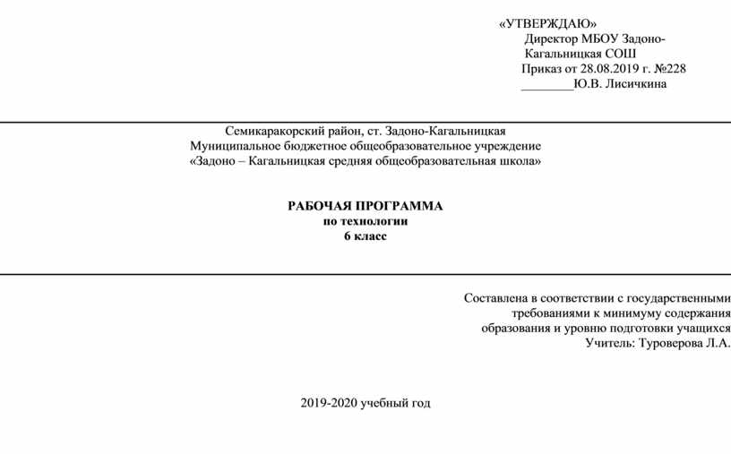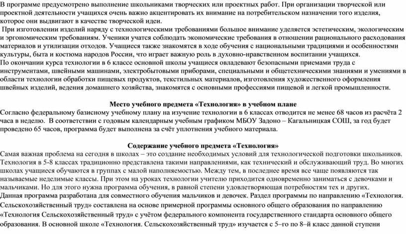 Согласно федеральному базисному учебному плану на изучение технологии в 6 классах отводится не менее 68 часов из расчёта 2 часа в неделю. В соответствии с годовым календарным учебным графиком МБОУ Задоно – Кагальницкая СОШ, за год будет проведено 65 часов, программа будет выполнена за счёт уплотнения учебного материала.