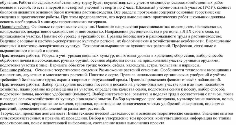 Данная программа разработана для совместного обучения мальчиков и девочек. Раздел программы по направлению «Технология. Сельскохозяйственный труд» составлена на основе примерной программы основного общего образования по направлению «Технология Сельскохозяйственный труд» с учётом федерального компонента государственного стандарта основного общего образования. В основной школе «Технология. Сельскохозяйственный труд» изучается с 5–го по 8–й класс данной ступени обучения. Работа по сельскохозяйственному труду будет осуществляться с учетом сезонности сельскохозяйственных работ осенью и весной, то есть в первой и четвертой учебной четверти по 2 часа. Школьный учебно-опытный участок (УОУ), кабинет биологии являются основной базой изучения растениеводства. Все разделы программы содержат основные теоретические сведения и практические работы. При этом предполагается, что перед выполнением практических работ школьники должны освоить необходимый минимум теоретического материала.