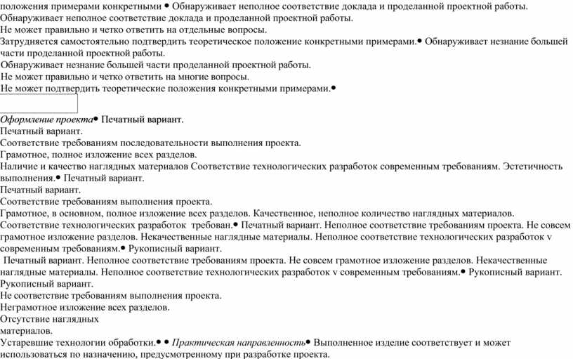 Печатный вариант. Неполное соответствие требованиям проекта. Не совсем грамотное изложение разделов. Некачественные наглядные материалы. Неполное соответствие технологических разработок v современным требованиям. |