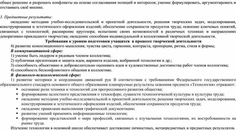 - использование в качестве объектов труда потребительских изделий и оформление их с учетом требований дизайна и декоративно-прикладного искусства для повышения конкурентоспособности при реализации, развитие эстетического чувства и художественной инициативы ребенка. Программа предмета «Технология» составлена с учетом полученных учащимися при обучении в начальной школе технологических знаний и опыта трудовой деятельности
