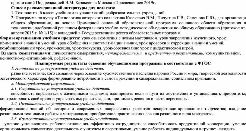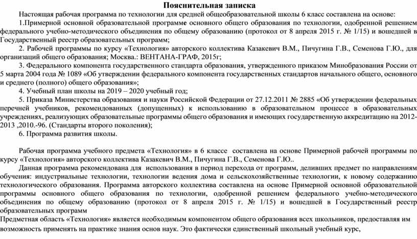 Рабочая программа учебного предмета «Технология» в 6 классе составлена на основе Примерной рабочей программы по курсу «Технология» авторского коллектива Казакевич В.М., Пичугина Г.В., Семенова Г.Ю..