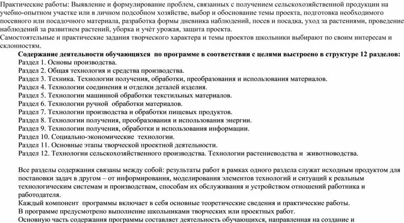 Каждый раздел программы включает в себя основные теоретические сведения, практические работы и объекты труда.