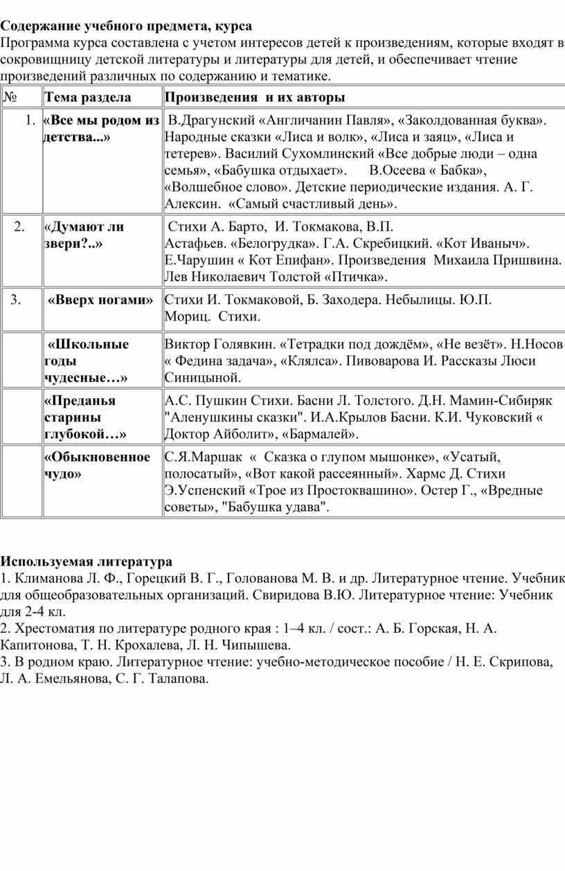 Круг чтения составляют художественные произведения и научно-популярные статьи. К изучению представлены те классические произведения мировой детской литературы, которые формируют основы читательской культуры младшего школьника. Учащимся предлагаются литературные произведения русской литературы. Прежде всего, это фольклорные и литературные художественные произведения разных жанров, традиционно входящие в чтение учащихся младшего школьного возраста и познавательные тексты (очерки).В программу входят произведения о школьной жизни, морально-нравственных проблемах (честности и лживости, дружелюбии и недоброжелательности, жадности и щедрости, хвастливости и скромности, трудолюбии и лени), о забавах детей, о природе (о растениях и животных, о временах года).