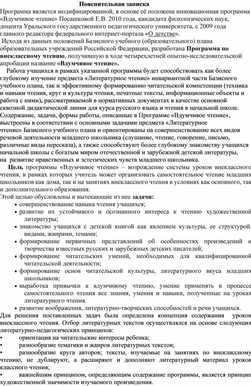 основе её положена инновационная программа «Вдумчивое чтение» Посашковой Е.В.