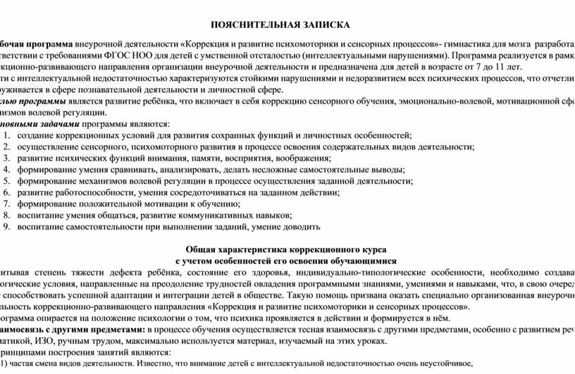 Рабочая программа внеурочной деятельности «Коррекция и развитие психомоторики и сенсорных процессов»- гимнастика для мозга разработана в соответствии с требованиями ФГОС НОО для детей с умственной отсталостью (интеллектуальными нарушениями). Программа реализуется в рамках коррекционно-развивающего направления организации внеурочной деятельности и предназначена для детей в возрасте от 7 до 11 лет.