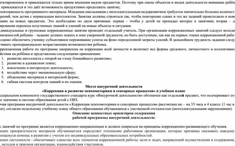 Учитывая степень тяжести дефекта ребёнка, состояние его здоровья, индивидуально-типологические особенности, необходимо создавать педагогические условия, направленные на преодоление трудностей овладения программными знаниями, умениями и навыками, что, в свою очередь, будет способствовать успешной адаптации и интеграции детей в обществе. Такую помощь призвана оказать специально организованная внеурочная деятельность коррекционно-развивающего направления «Коррекция и развитие психомоторики и сенсорных процессов».