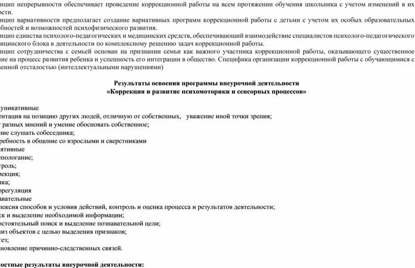 Коррекционная работа по программе направлена на коррекцию всей личности и включает все формы средового, личностного и коллективного воздействия на ребёнка и представлена следующими принципами: