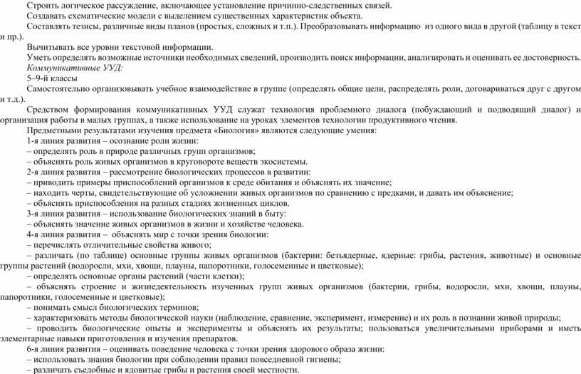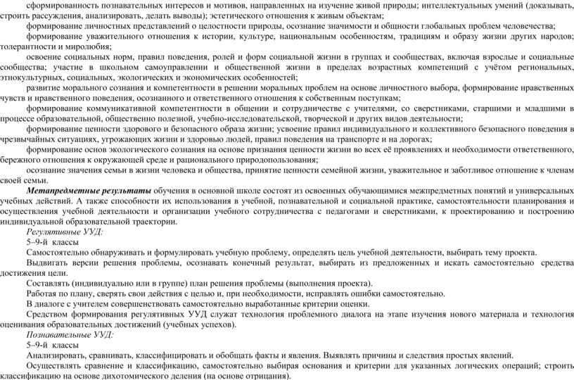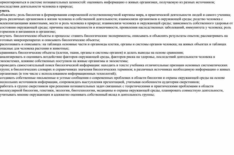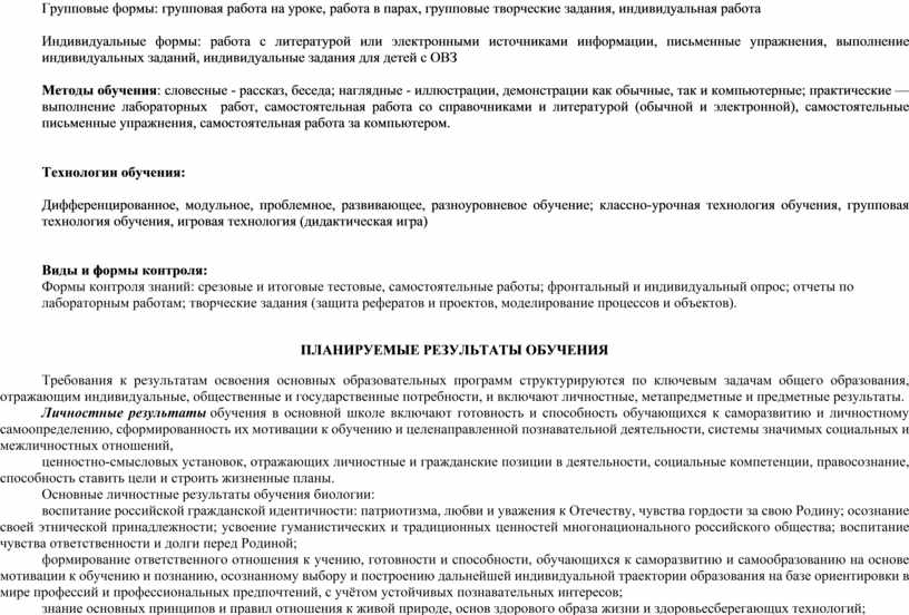 В рабочей программе нашли отражение цели и задачи изучения биологии на ступени основного общего образования, изложенные в пояснительной записке к Примерной программе по биологии. В ней также заложены возможности предусмотренного стандартом формирования у обучающихся общеучебных умений и навыков, универсальных способов деятельности и ключевых компетенций. В календарно – тематическое планирование программы включена колонка «Приёмы и методы работы с детьми с ОВЗ», в которой отражена индивидуальная работа.
