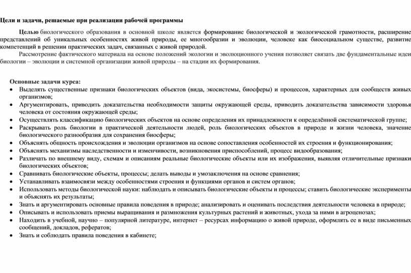 Целью биологического образования в основной школе является формирование биологической и экологической грамотности, расширение представлений об уникальных особенностях живой природы, ее многообразии и эволюции, человеке как биосоциальном существе, развитие компетенций в решении практических задач, связанных с живой природой.