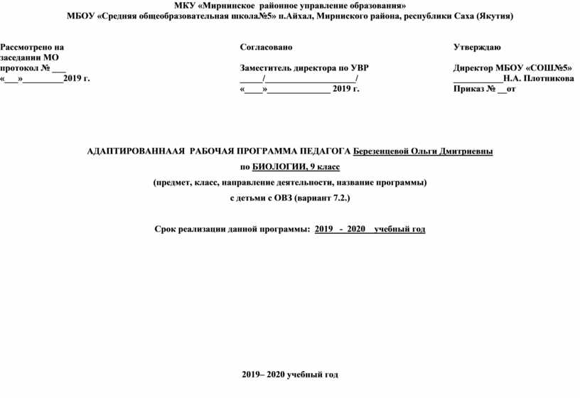 АДАПТИРОВАННААЯ РАБОЧАЯ ПРОГРАММА ПЕДАГОГА Березенцевой Ольги Дмитриевны