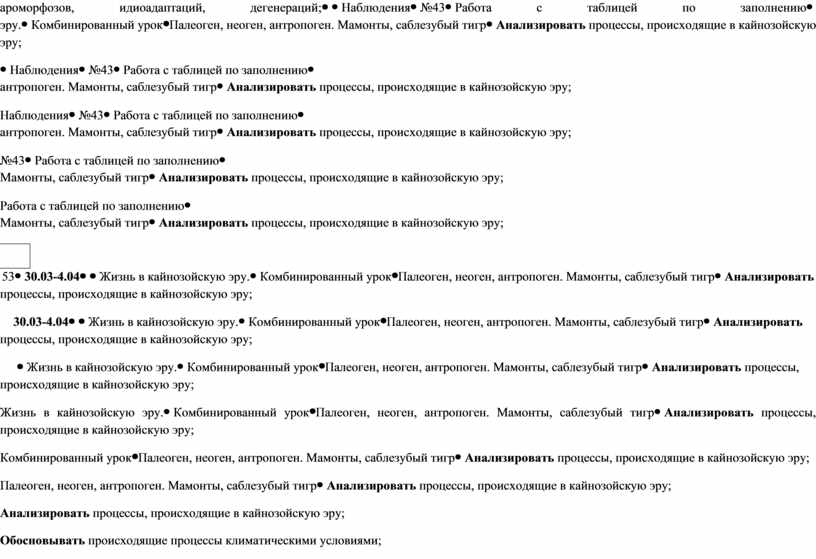 Анализировать процессы, происходящие в кайнозойскую эру; Обосновывать происходящие процессы климатическими условиями; Приводить примеры организмов, живущих в данной эре; Выделять примеры переходных форм, ароморфозов, идиоадаптаций, дегенераций; |