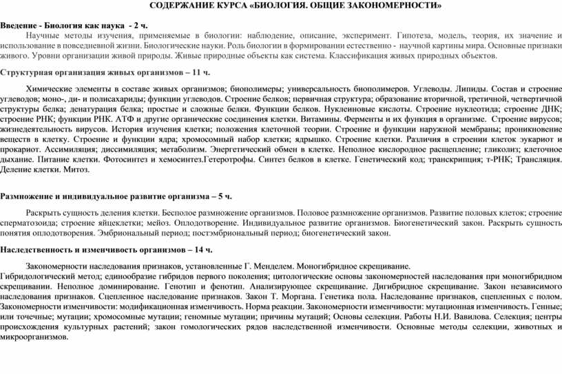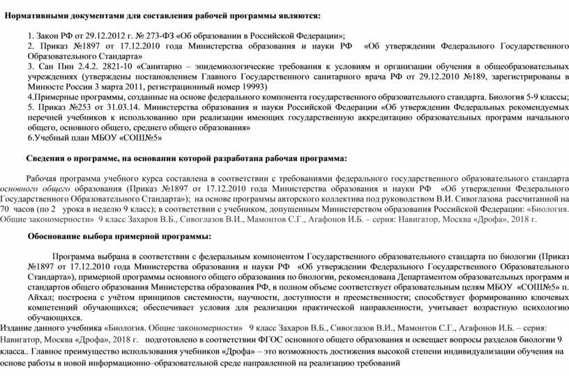 Рабочая программа учебного курса составлена в соответствии с требованиями федерального государственного образовательного стандарта основного общего образования (Приказ №1897 от 17.12.2010 года Министерства образования и науки РФ «Об утверждении Федерального Государственного Образовательного Стандарта»); на основе программы авторского коллектива под руководством В.И. Сивоглазова рассчитанной на 70 часов (по 2 урока в неделю 9 класс); в соответствии с учебником, допущенным Министерством образования Российской Федерации: «Биология. Общие закономерности» 9 класс Захаров В.Б., Сивоглазов В.И., Мамонтов С.Г., Агафонов И.Б. – серия: Навигатор, Москва «Дрофа», 2018 г.