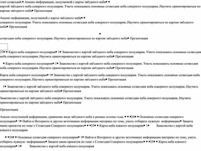 Знакомство с картой звёздного неба северного полушария. Уметь показывать основные созвездия неба северного полушария..Научить ориентироваться по картам звёздного неба |