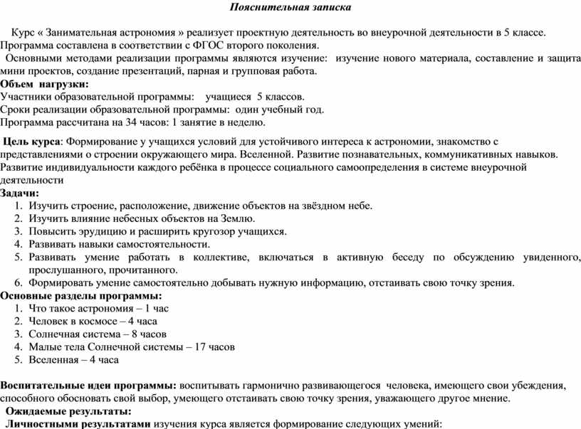 Курс « Занимательная астрономия » реализует проектную деятельность во внеурочной деятельности в 5 классе. Программа составлена в соответствии с ФГОС второго поколения.