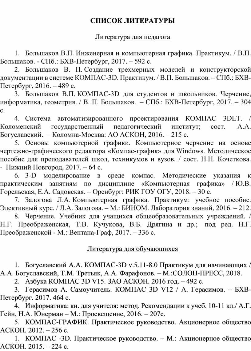 1. Богуславский А.А. КОМПАС-3D v.5.11-8.0 Практикум для начинающих / А.А. Богуславский, Т.М. Третьяк, А.А. Фарафонов. – М.:СОЛОН-ПРЕСС, 2018.
