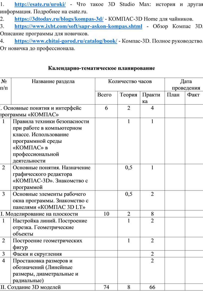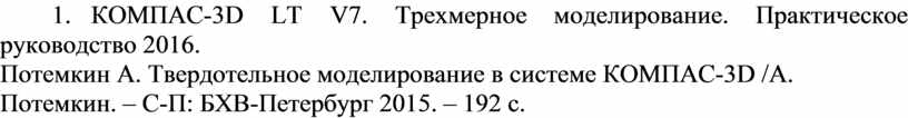 2. Большаков В. П. Создание трехмерных моделей и конструкторской документации в системе КОМПАС-3D. Практикум. / В.П. Большаков. – СПб.: БХВ-Петербург, 2016. – 489 с.