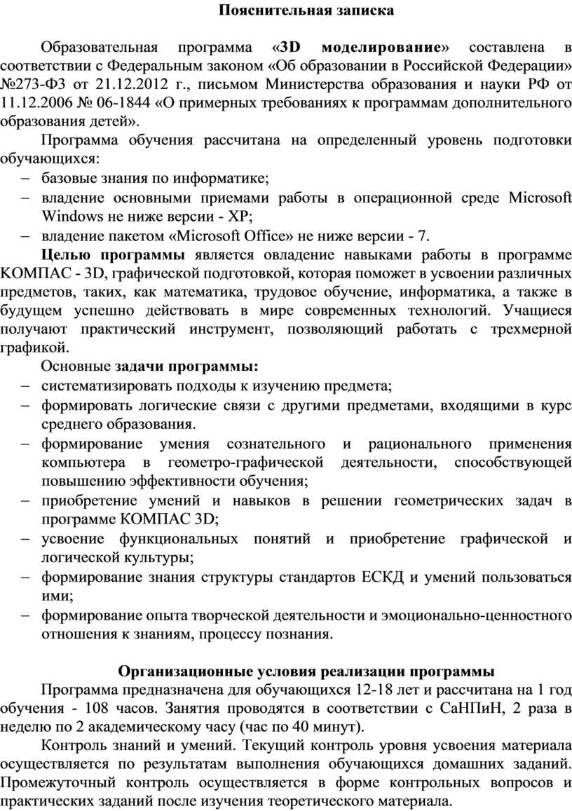Образовательная программа «3D моделирование» составлена в соответствии с Федеральным законом «Об образовании в Российской Федерации» №273-Ф3 от 21.12.2012 г., письмом Министерства образования и науки РФ от 11.12.2006 № 06-1844 «О примерных требованиях к программам дополнительного образования детей».