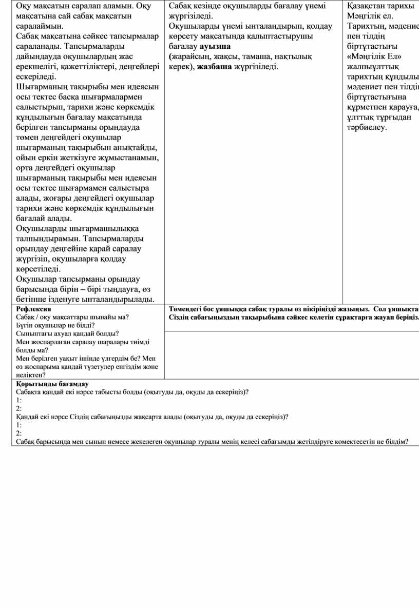 Төмендегі бос ұяшыққа сабақ туралы өз пікіріңізді жазыңыз. Сол ұяшықтағы Сіздің сабағыңыздың тақырыбына сәйкес келетін сұрақтарға жауап беріңіз.