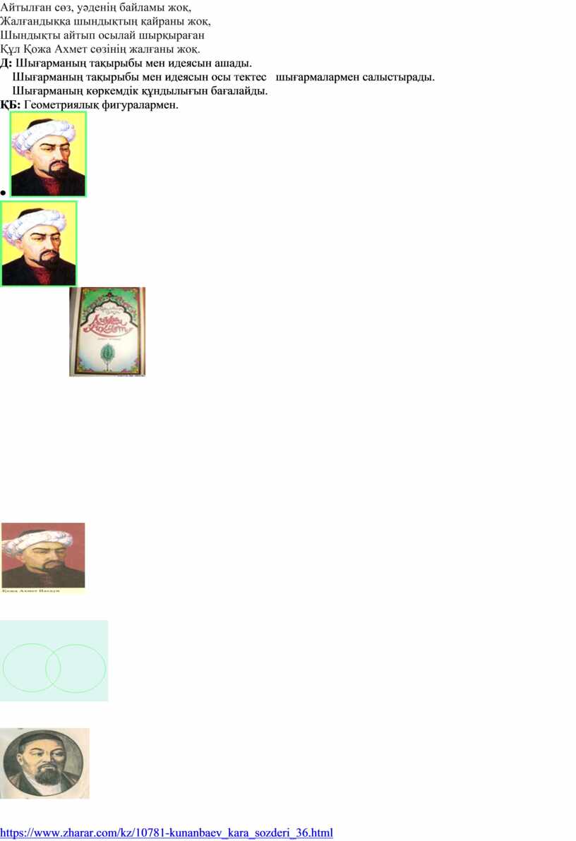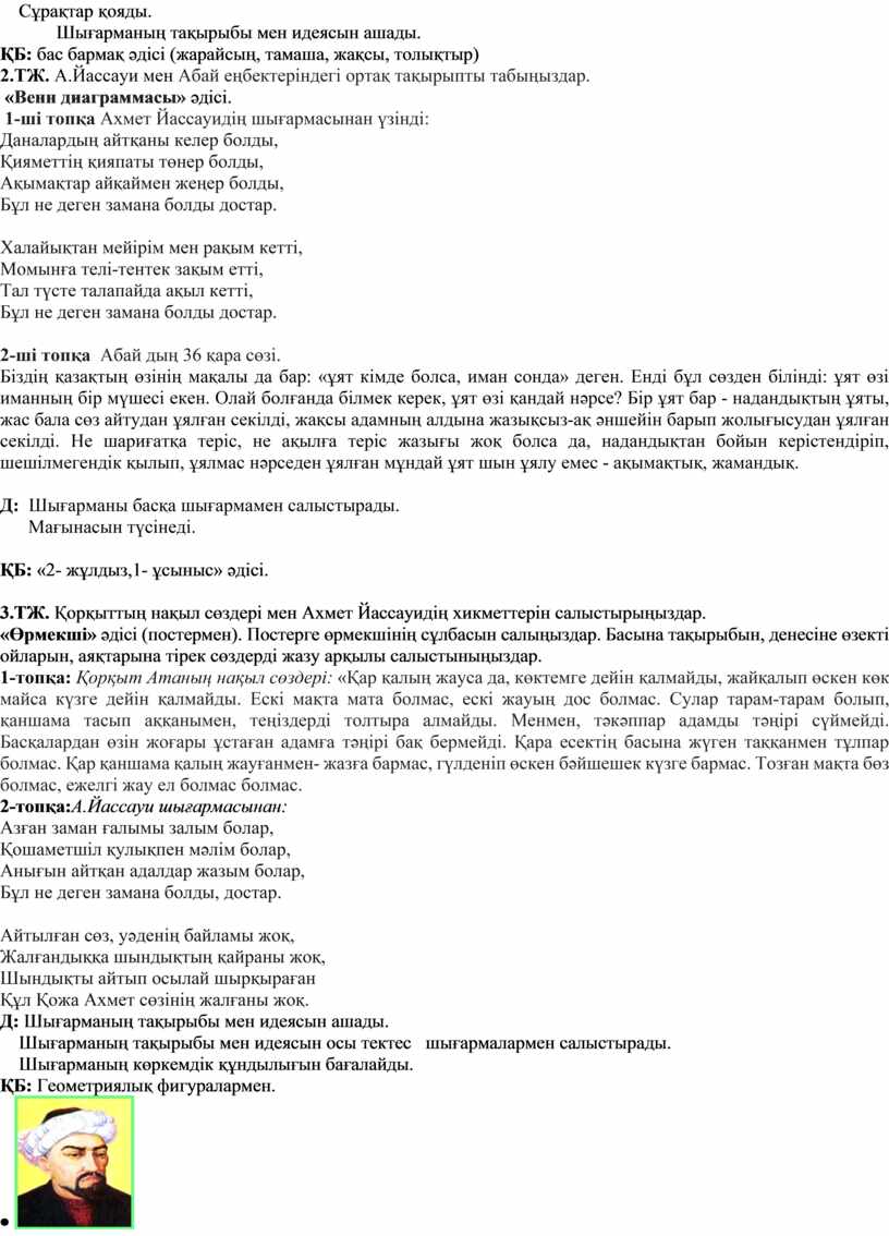 Д: Шығарманы талқылайды. Сұрақтар қояды. Шығарманың тақырыбы мен идеясын ашады. ҚБ: бас бармақ әдісі (жарайсың, тамаша, жақсы, толықтыр) 2.ТЖ. А.Йассауи мен Абай еңбектеріндегі ортақ тақырыпты табыңыздар. «Венн диаграммасы» әдісі. 1-ші топқа Ахмет Йассауидің шығармасынан үзінді: Даналардың айтқаны келер болды, Қияметтің қияпаты төнер болды, Ақымақтар айқаймен жеңер болды, Бұл не деген замана болды достар.