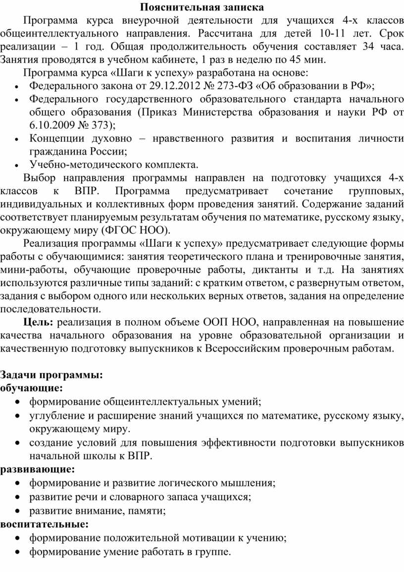 Выбор направления программы направлен на подготовку учащихся 4-х классов к ВПР. Программа предусматривает сочетание групповых, индивидуальных и коллективных форм проведения занятий. Содержание заданий соответствует планируемым результатам обучения по математике, русскому языку, окружающему миру (ФГОС НОО).