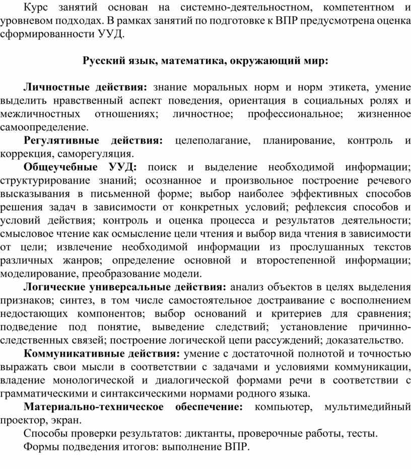 Курс занятий основан на системно-деятельностном, компетентном и уровневом подходах. В рамках занятий по подготовке к ВПР предусмотрена оценка сформированности УУД.