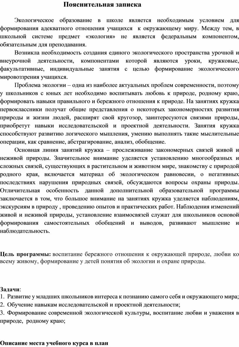 Проблема экологии – одна из наиболее актуальных проблем современности, поэтому у школьников с юных лет необходимо воспитывать любовь к природе, родному краю, формировать навыки правильного и бережного отношения к природе. На занятиях кружка первоклассники получат общие представления о некоторых закономерностях развития природы и жизни людей, расширят свой кругозор, заинтересуются связями природы, приобретут навыки исследовательской и проектной деятельности. Занятия кружка способствуют развитию логического мышления, умению выполнять такие мыслительные операции, как сравнение, абстрагирование, анализ, обобщение.
