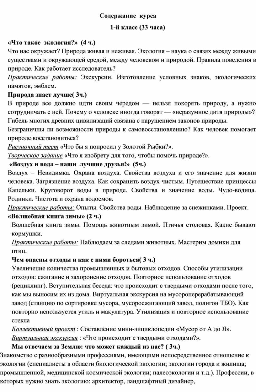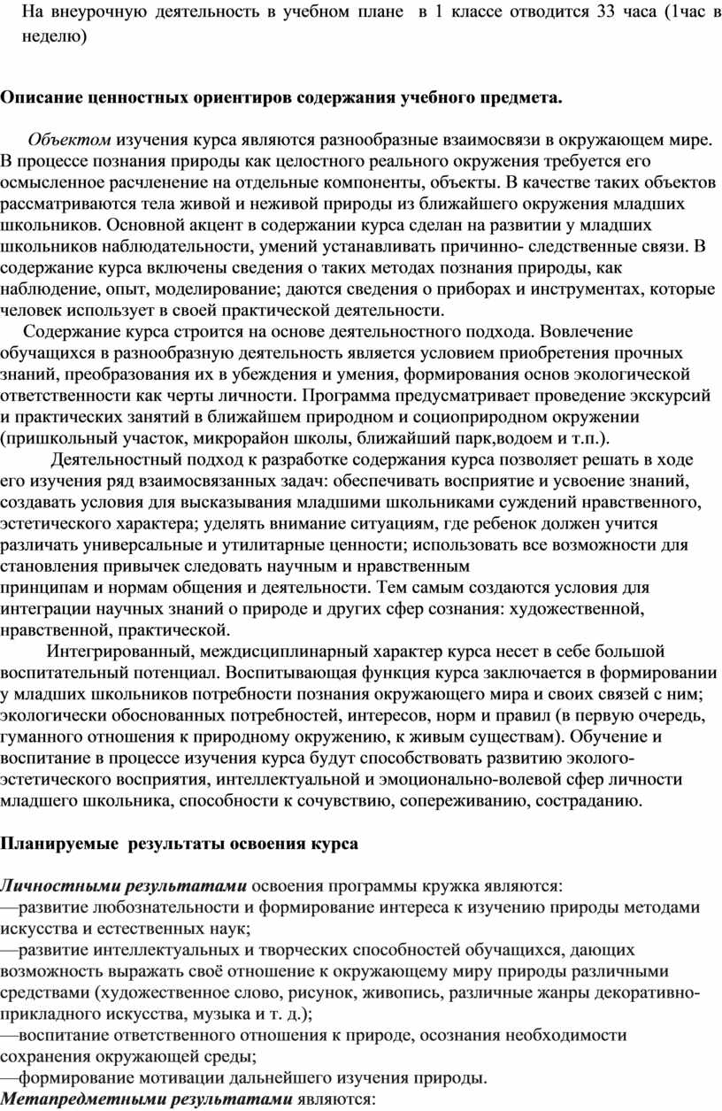 Объектом изучения курса являются разнообразные взаимосвязи в окружающем мире. В процессе познания природы как целостного реального окружения требуется его осмысленное расчленение на отдельные компоненты, объекты. В качестве таких объектов рассматриваются тела живой и неживой природы из ближайшего окружения младших школьников. Основной акцент в содержании курса сделан на развитии у младших школьников наблюдательности, умений устанавливать причинно- следственные связи. В содержание курса включены сведения о таких методах познания природы, как наблюдение, опыт, моделирование; даются сведения о приборах и инструментах, которые человек использует в своей практической деятельности.