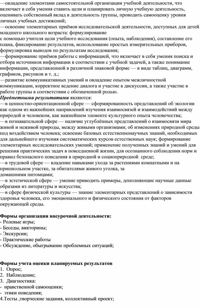 Интегрированный, междисциплинарный характер курса несет в себе большой воспитательный потенциал. Воспитывающая функция курса заключается в формировании у младших школьников потребности познания окружающего мира и своих связей с ним; экологически обоснованных потребностей, интересов, норм и правил (в первую очередь, гуманного отношения к природному окружению, к живым существам). Обучение и воспитание в процессе изучения курса будут способствовать развитию эколого-эстетического восприятия, интеллектуальной и эмоционально-волевой сфер личности младшего школьника, способности к сочувствию, сопереживанию, состраданию.