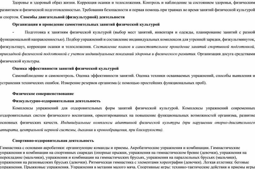 Здоровье и здоровый образ жизни. Коррекция осанки и телосложения. Контроль и наблюдение за состоянием здоровья, физическим развитием и физической подготовленностью. Требования безопасности и первая помощь при травмах во время занятий физической культурой и спортом. Способы двигательной (физкультурной) деятельности