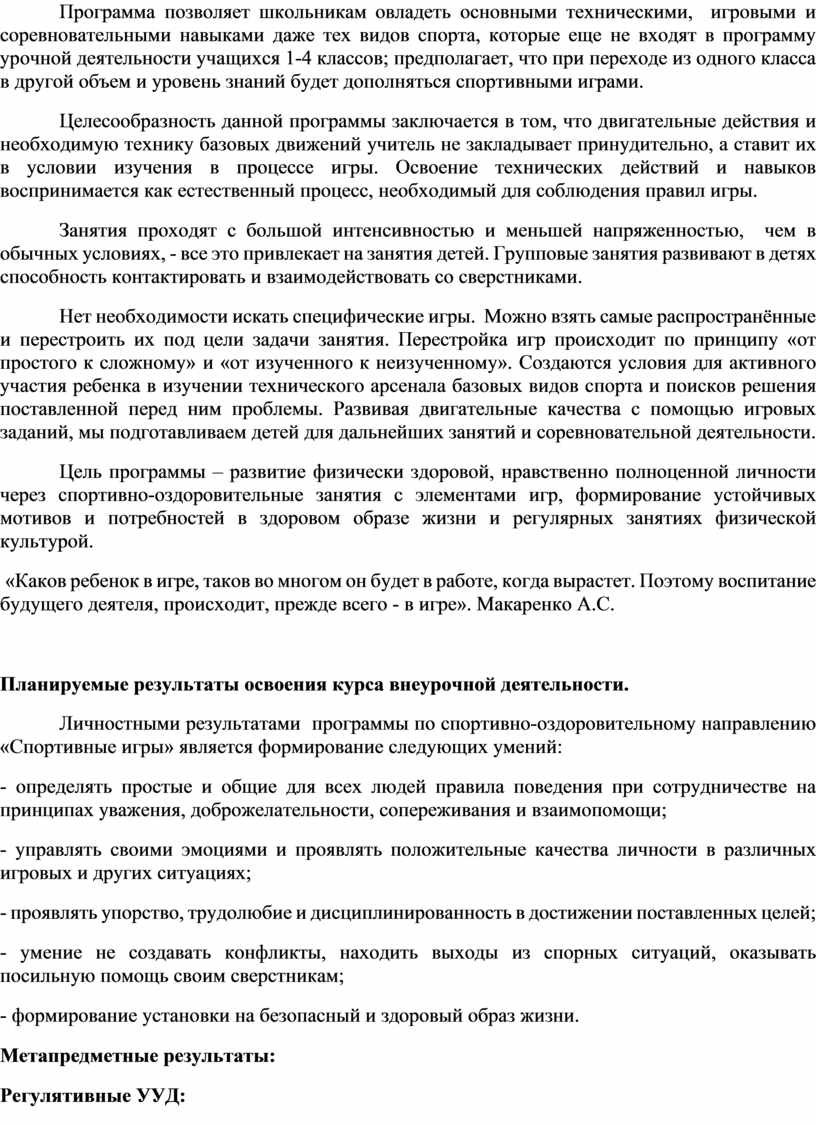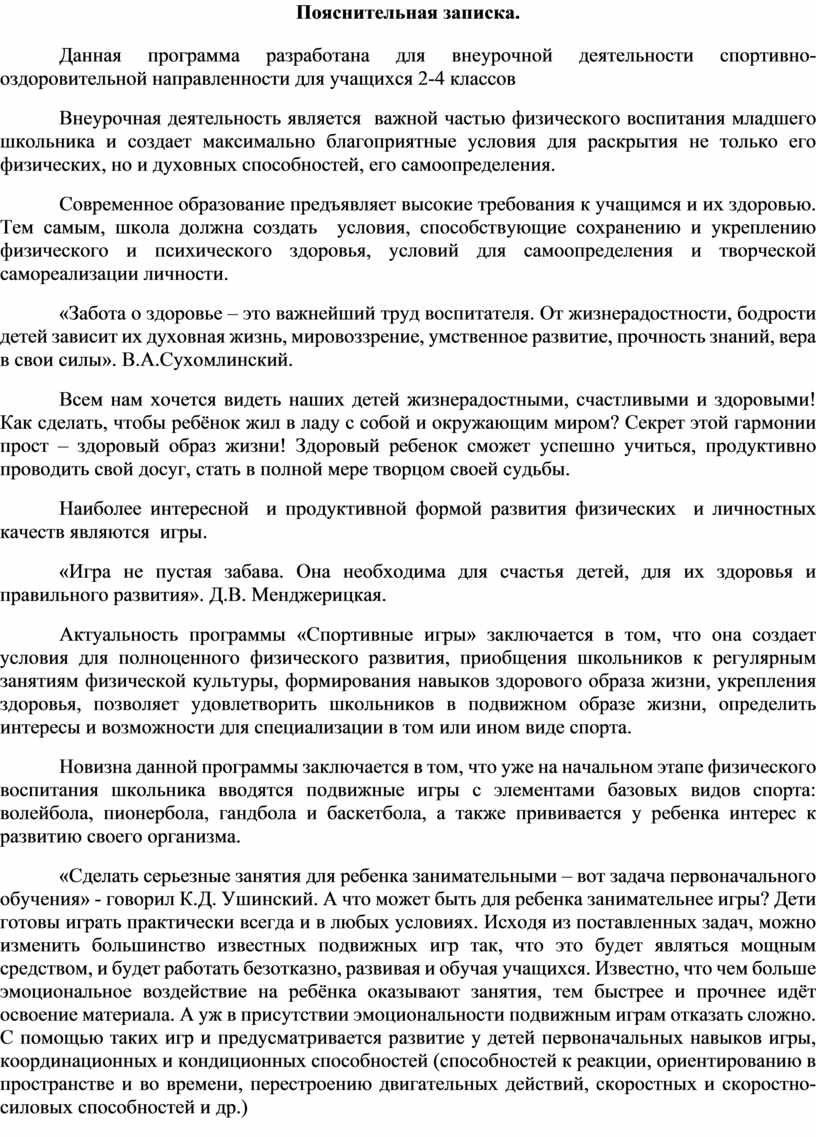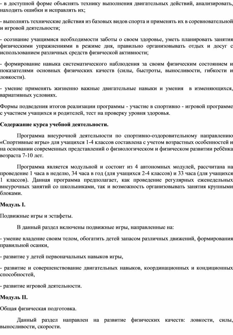 Программа внеурочной деятельности по спортивно-оздоровительному направлению «Спортивные игры» для учащихся 1-4 классов составлена с учетом возрастных особенностей и на основании современных представлений о физиологическом и физическом развитии ребёнка возраста 7-10 лет.