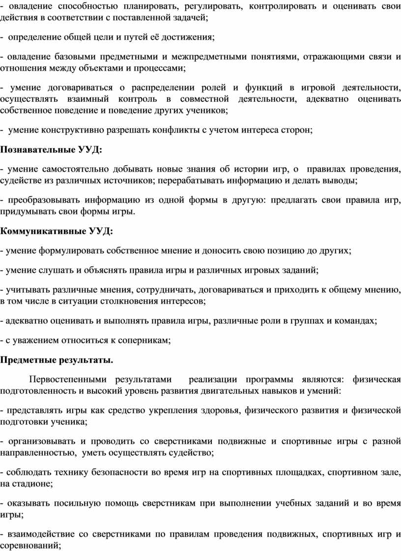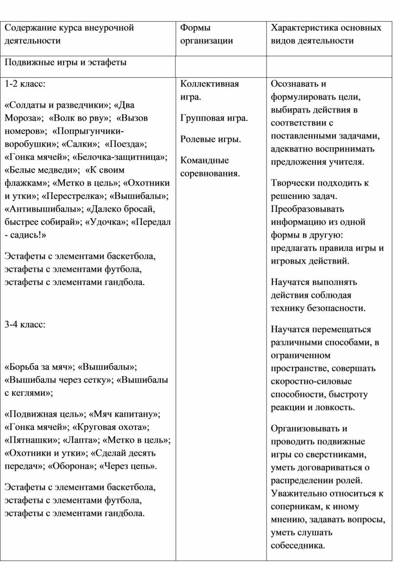 Программа позволяет школьникам овладеть основными техническими, игровыми и соревновательными навыками даже тех видов спорта, которые еще не входят в программу урочной деятельности учащихся 1-4 классов; предполагает, что при переходе из одного класса в другой объем и уровень знаний будет дополняться спортивными играми.