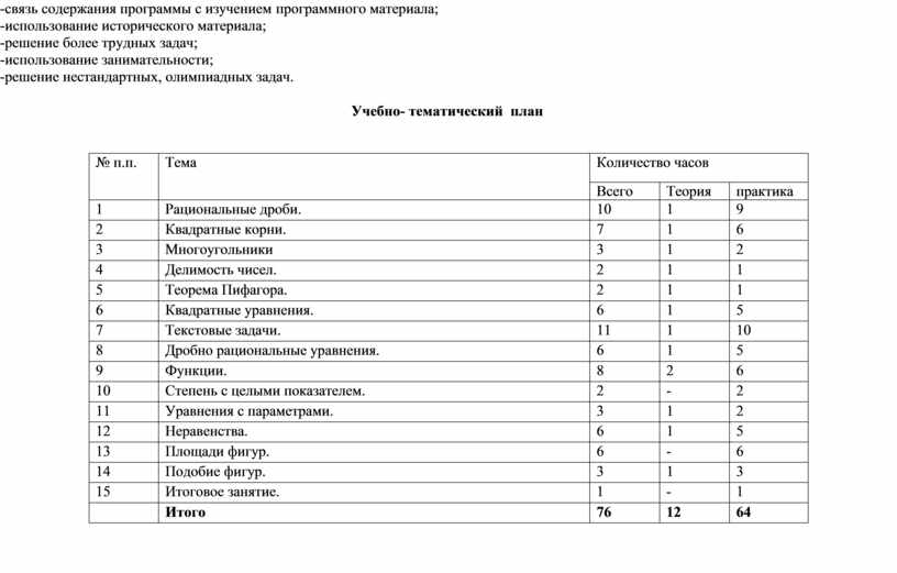 Настоящая программа рассчитана на 1 год обучения и предназначена для работы с обучающимися 8 класса. Занятия проводятся 1 раз в неделю по 2 часа (76 часов в год).