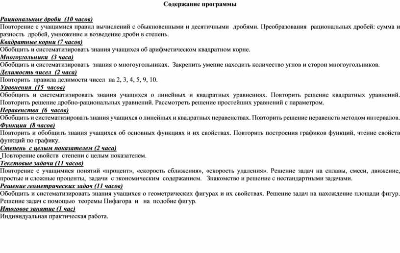 Повторение с учащимися понятий «процент», «скорость сближения», «скорость удаления». Решение задач на сплавы, смеси, движение, простые и сложные проценты, задачи с экономическим содержанием. Знакомство и решение с нестандартными задачами.