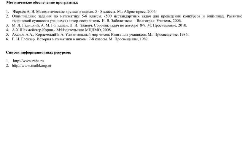 1. Фарков А. В. Математические кружки в школе. 5 - 8 классы. М.: Айрис-пресс, 2006.