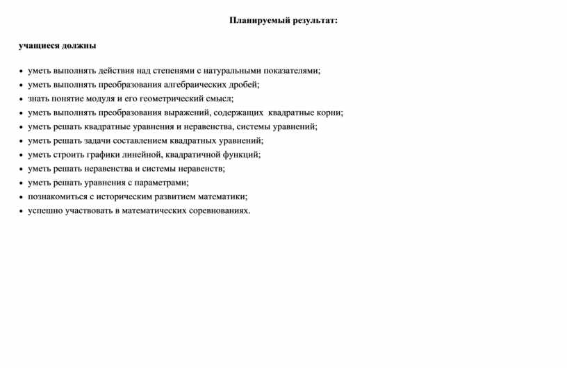 · уметь решать квадратные уравнения и неравенства, системы уравнений;