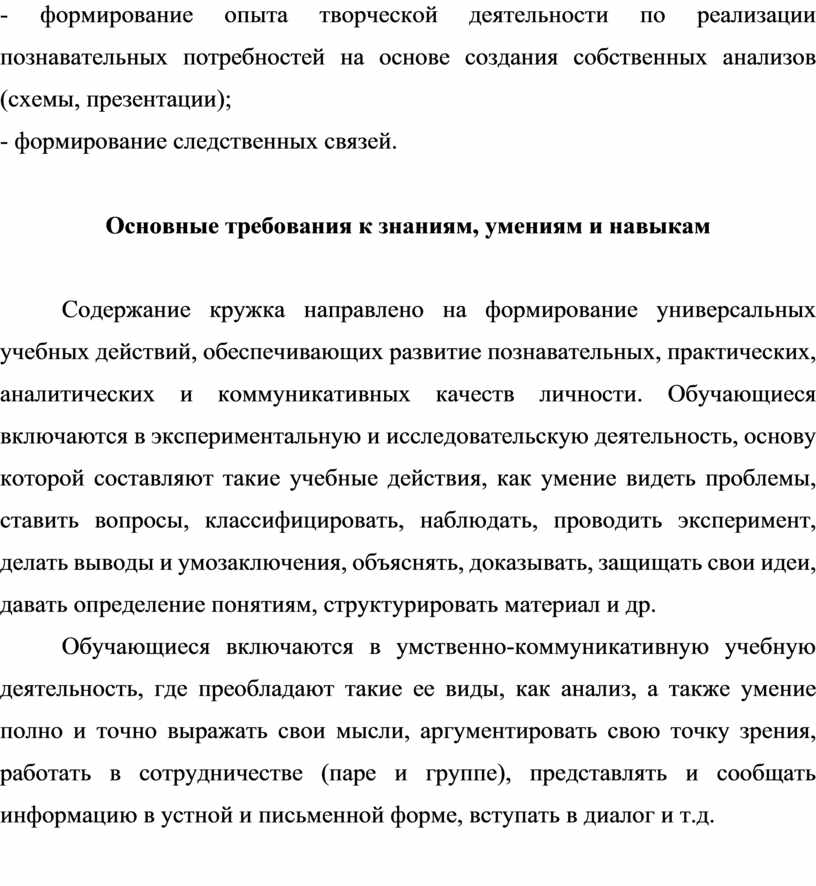 Содержание кружка направлено на формирование универсальных учебных действий, обеспечивающих развитие познавательных, практических, аналитических и коммуникативных качеств личности. Обучающиеся включаются в экспериментальную и исследовательскую деятельность, основу которой составляют такие учебные действия, как умение видеть проблемы, ставить вопросы, классифицировать, наблюдать, проводить эксперимент, делать выводы и умозаключения, объяснять, доказывать, защищать свои идеи, давать определение понятиям, структурировать материал и др.