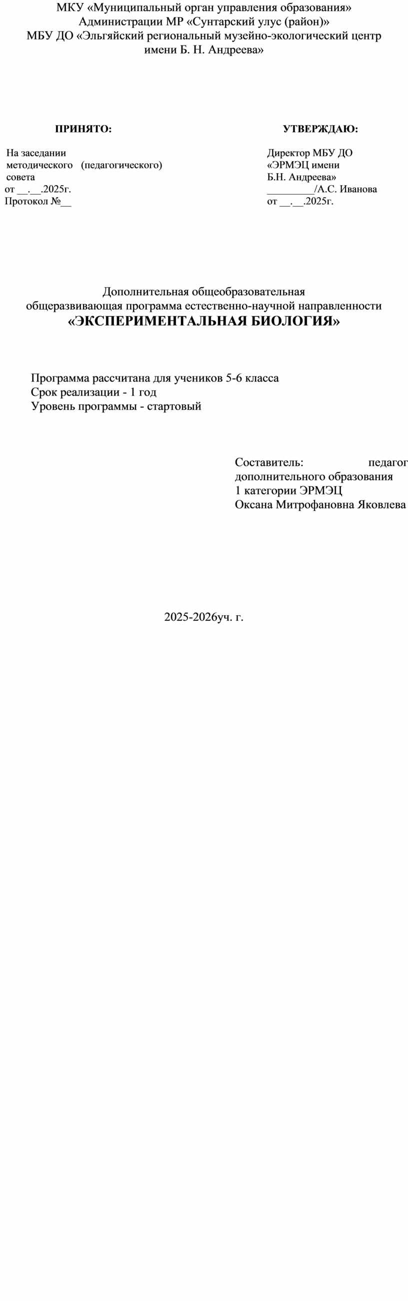 Директор МБУ ДО «ЭРМЭЦ имени Б.Н. Андреева» _________/А.С. Иванова от __.__.2025г. |