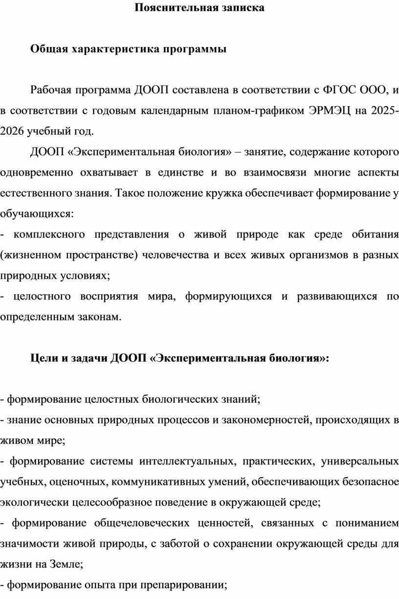Цели и задачи ДООП «Экспериментальная биология»: