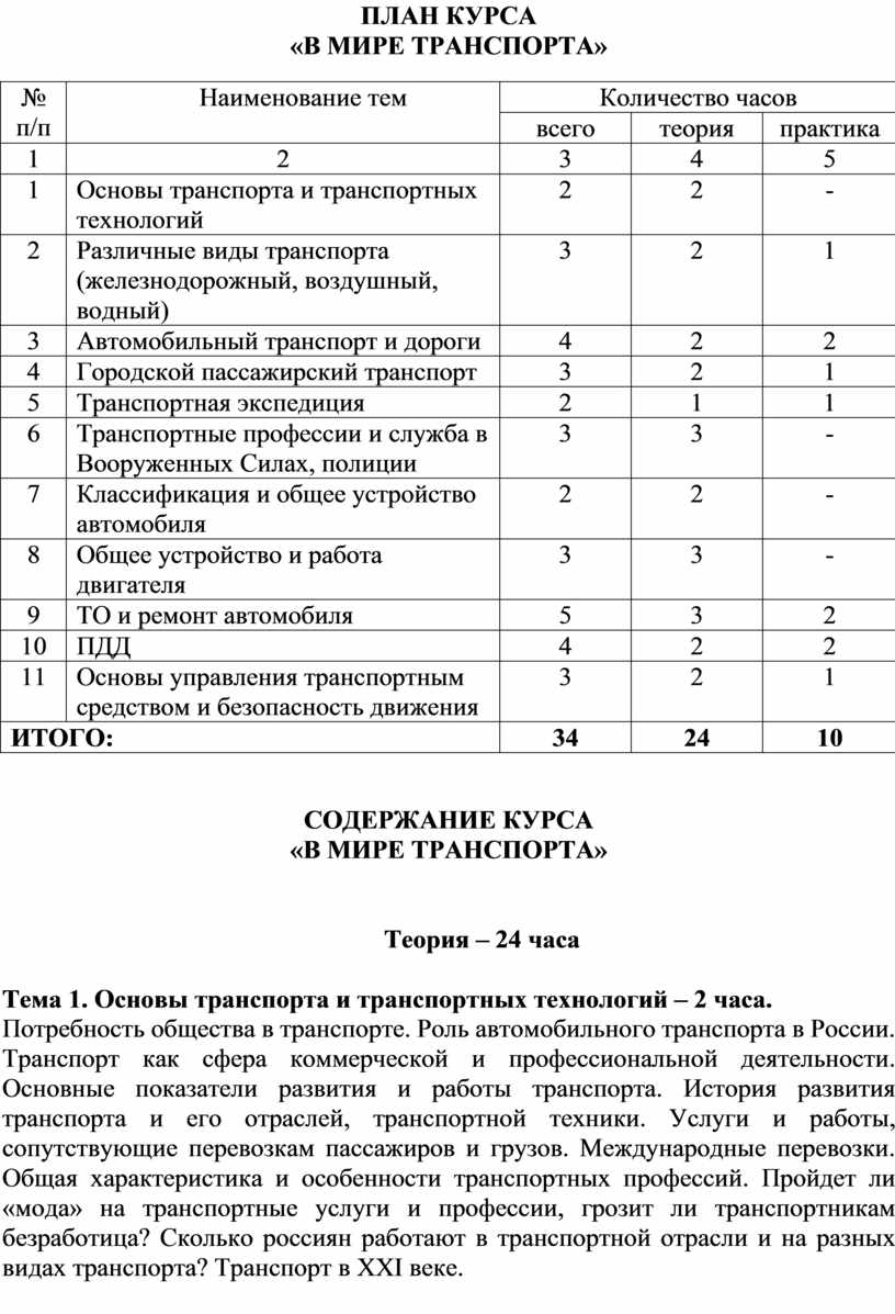 Потребность общества в транспорте. Роль автомобильного транспорта в России. Транспорт как сфера коммерческой и профессиональной деятельности. Основные показатели развития и работы транспорта. История развития транспорта и его отраслей, транспортной техники. Услуги и работы, сопутствующие перевозкам пассажиров и грузов. Международные перевозки. Общая характеристика и особенности транспортных профессий. Пройдет ли «мода» на транспортные услуги и профессии, грозит ли транспортникам безработица? Сколько россиян работают в транспортной отрасли и на разных видах транспорта? Транспорт в XXI веке.