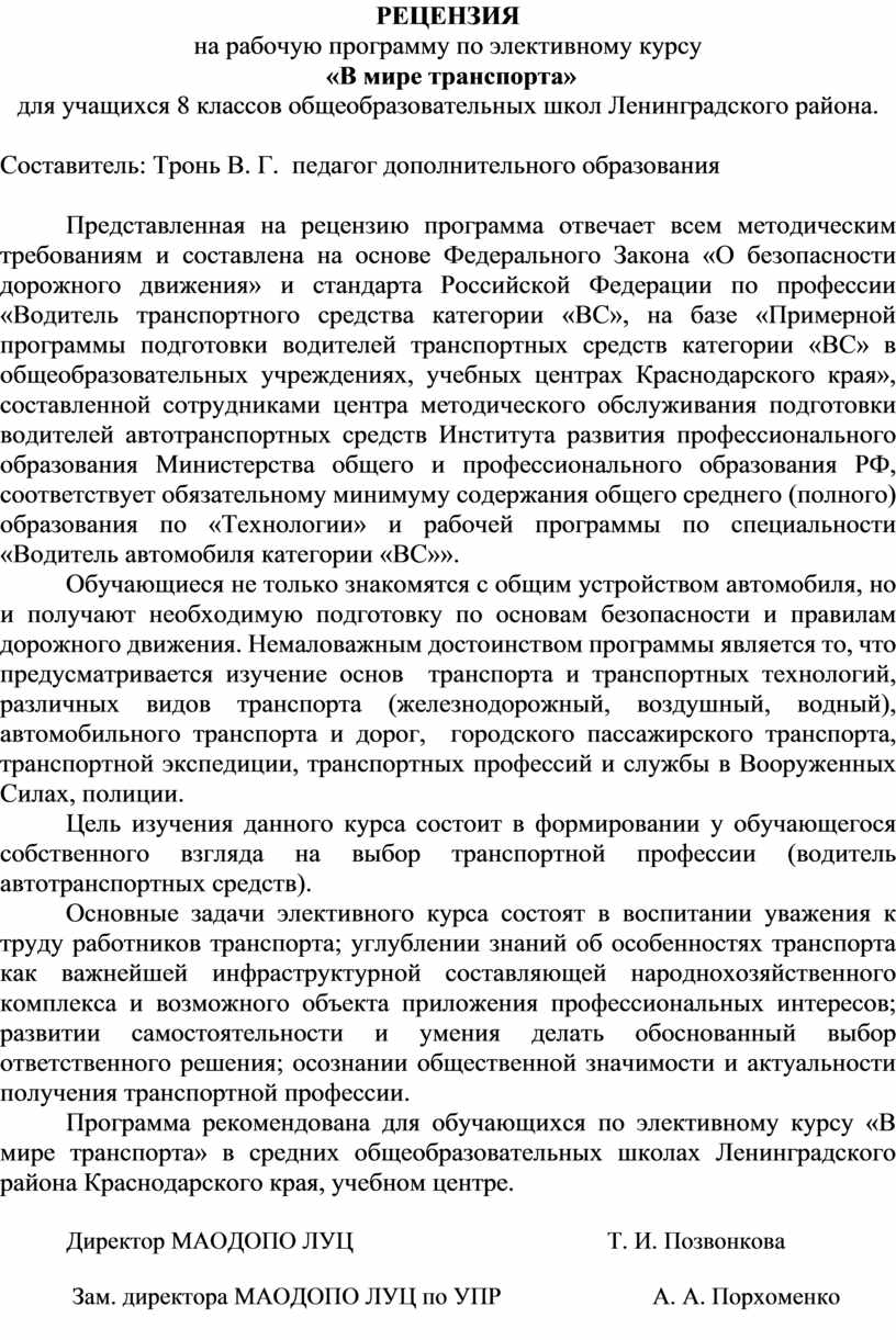 Представленная на рецензию программа отвечает всем методическим требованиям и составлена на основе Федерального Закона «О безопасности дорожного движения» и стандарта Российской Федерации по профессии «Водитель транспортного средства категории «ВС», на базе «Примерной программы подготовки водителей транспортных средств категории «ВС» в общеобразовательных учреждениях, учебных центрах Краснодарского края», составленной сотрудниками центра методического обслуживания подготовки водителей автотранспортных средств Института развития профессионального образования Министерства общего и профессионального образования РФ, соответствует обязательному минимуму содержания общего среднего (полного) образования по «Технологии» и рабочей программы по специальности «Водитель автомобиля категории «ВС»».