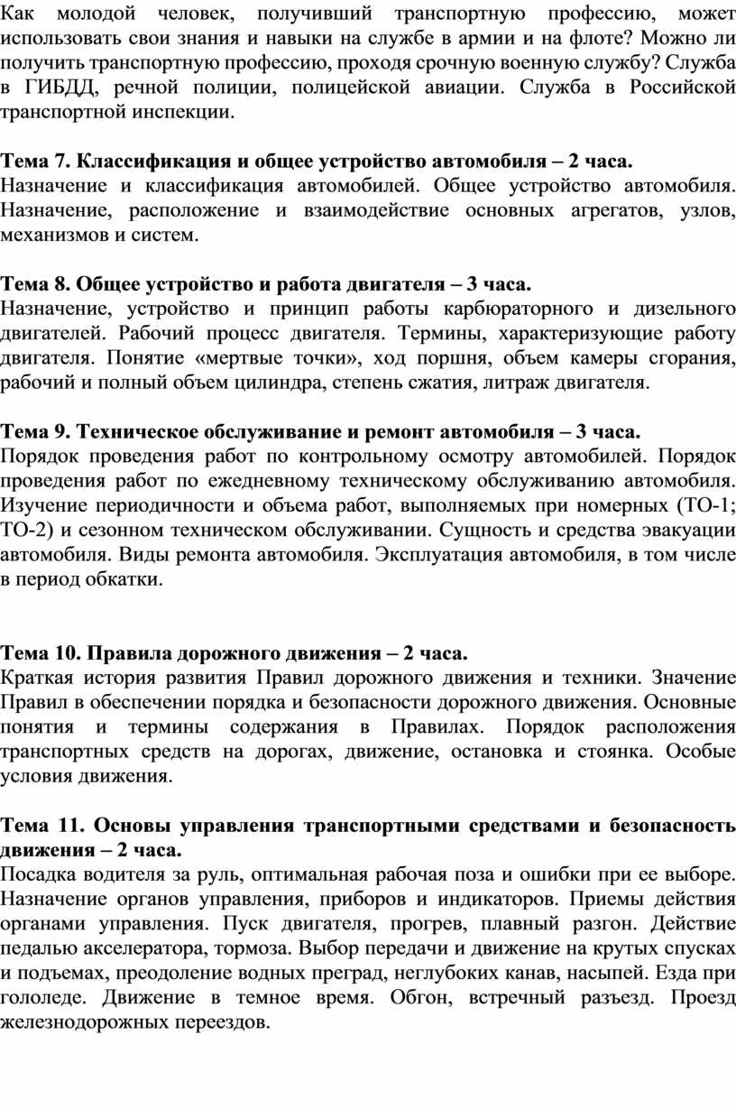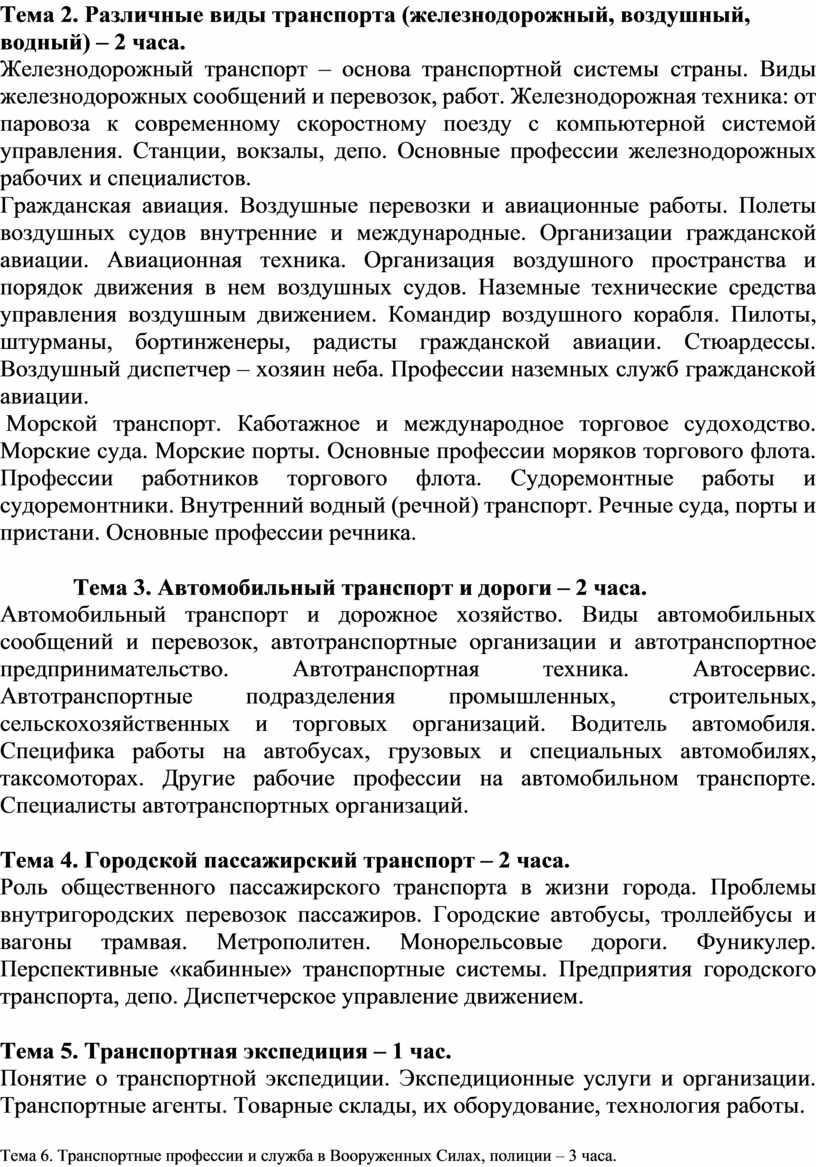 Тема 6. Транспортные профессии и служба в Вооруженных Силах, полиции – 3 часа.