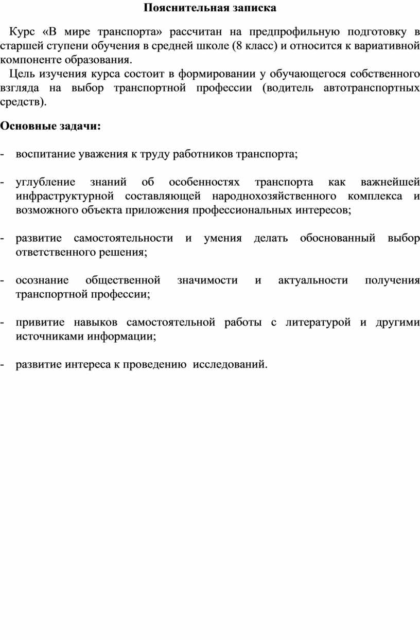 Курс «В мире транспорта» рассчитан на предпрофильную подготовку в старшей ступени обучения в средней школе (8 класс) и относится к вариативной компоненте образования.