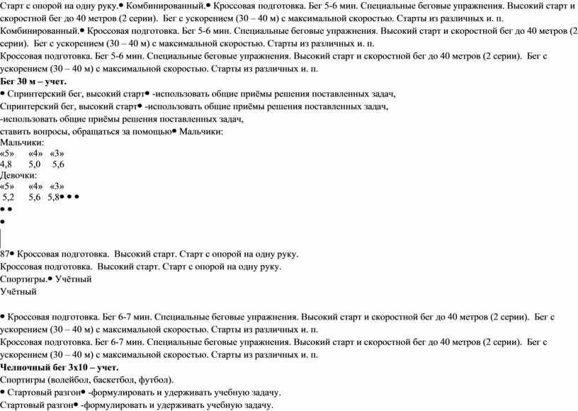 Кроссовая подготовка. Бег 5-6 мин. Специальные беговые упражнения. Высокий старт и скоростной бег до 40 метров (2 серии). Бег с ускорением (30 – 40 м) с максимальной скоростью. Старты из различных и. п. Бег 30 м – учет.