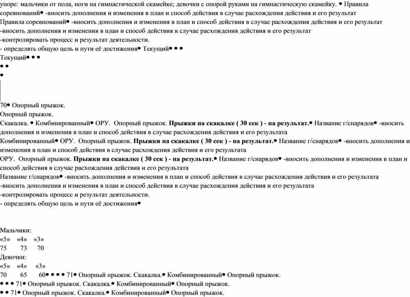 Мальчики: «5» «4» «3» 75 73 70 Девочки: «5» «4» «3» 70 65 60 |
