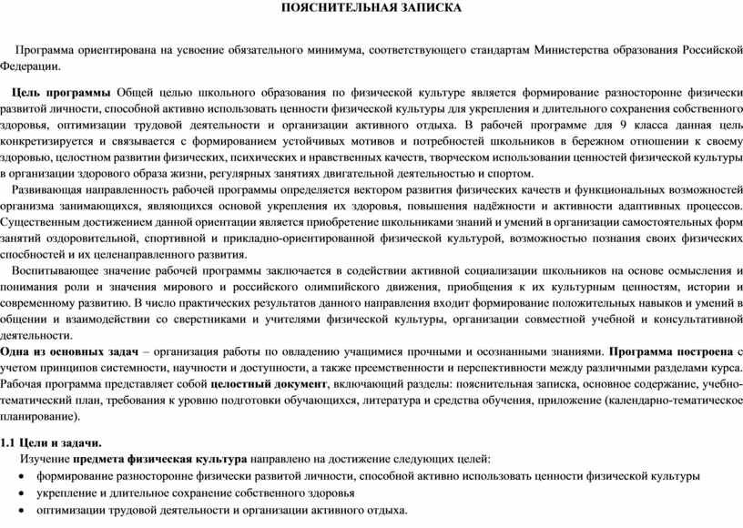 Цель программы Общей целью школьного образования по физической культуре является формирование разносторонне физически развитой личности, способной активно использовать ценности физической культуры для укрепления и длительного сохранения собственного здоровья, оптимизации трудовой деятельности и организации активного отдыха. В рабочей программе для 9 класса данная цель конкретизируется и связывается с формированием устойчивых мотивов и потребностей школьников в бережном отношении к своему здоровью, целостном развитии физических, психических и нравственных качеств, творческом использовании ценностей физической культуры в организации здорового образа жизни, регулярных занятиях двигательной деятельностью и спортом.