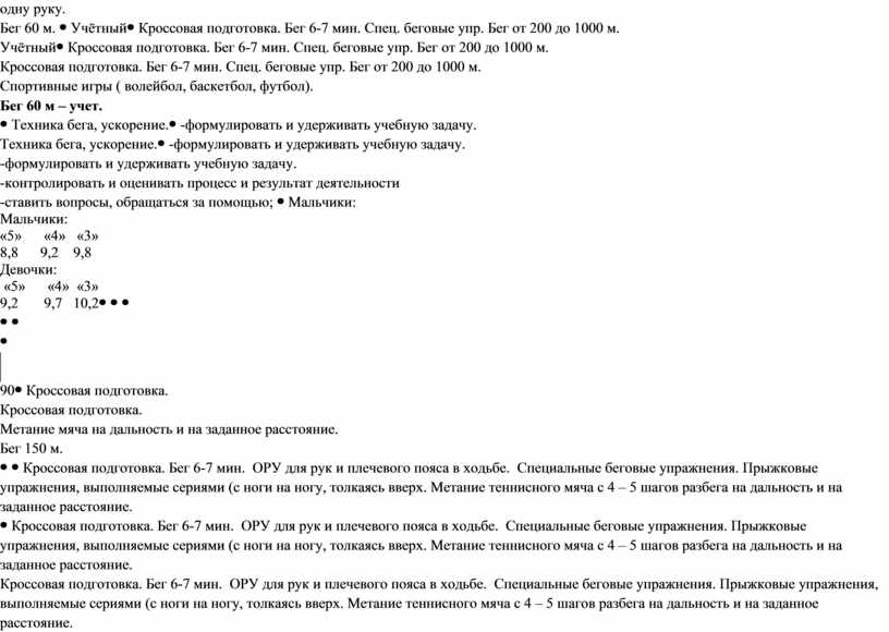 Кроссовая подготовка. Бег 6-7 мин. Спец. беговые упр. Бег от 200 до 1000 м. Спортивные игры ( волейбол, баскетбол, футбол). Бег 60 м – учет.